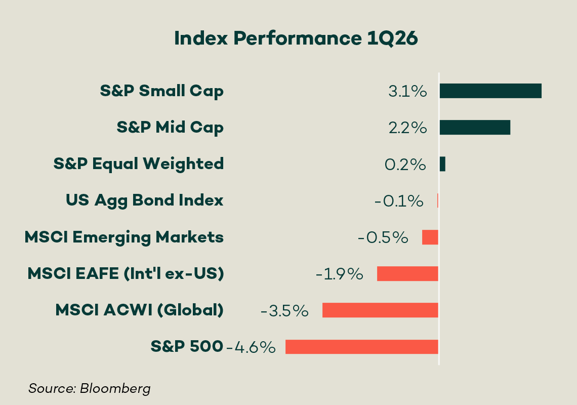 With "mission accomplished" turning to "mission impossible" as March proceeded, markets moved dramatically, with bond yields and stock prices swinging wildly on every major news update. By the end of the quarter on March 31, US and global large-cap indices were both down, -4.6% and -3.5%, respectively. US small and mid-cap stocks did better, returning 3.1% and 2.2% respectively, largely because of outsized exposure to energy. Bond investors (Barclays Agg) gave back much of their quarterly gains as yields rose amid fears of a prolonged Middle East conflict that could reignite energy-driven inflation.