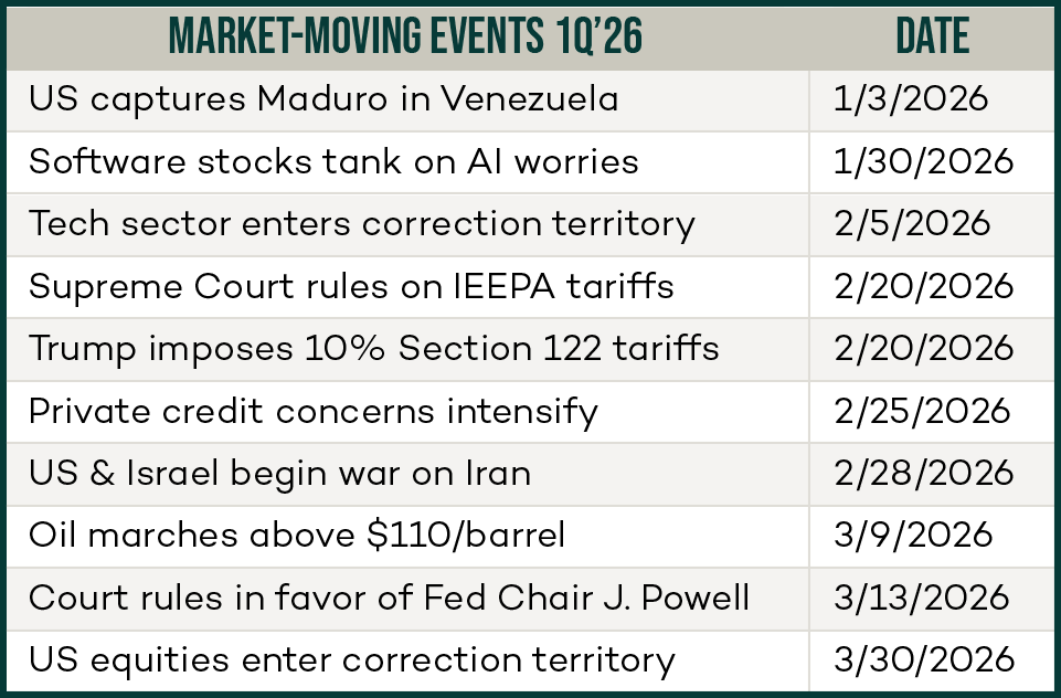 The first quarter of 2026 began with a covert military operation on one continent and ended with an overt one on another. As the chart to the right illustrates, nearly every trading week brought a new shock. Some were norm-breaking, like the White House's pressure campaign on the Fed; some potentially systemic, like the fractures emerging in private credit. Each one forced markets to reprice risk before the last shock had fully settled. By any measure (volatility, drawdown, dispersion, number of events), it was the most eventful – and nerve-rattling – quarter in recent memory.
