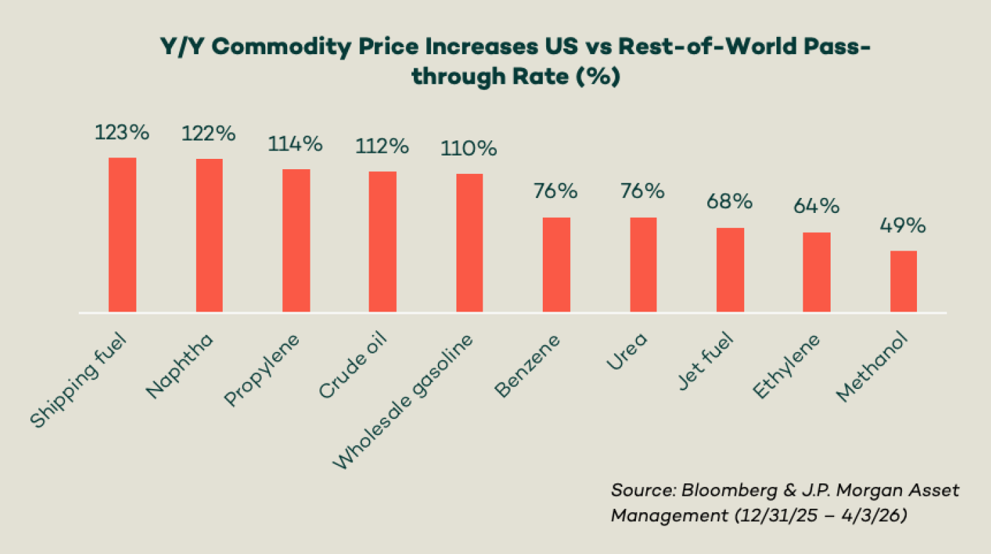 War in Iran has created a new urgency for energy demand around the world, including the U.S. The war has exposed a deep-seated fragility in the US energy market, one that runs counter to what we hear from the government and news media. A recent J.P. Morgan “Eye on the Market” report for April 2026 put it plainly: US fossil fuel independence is not the economic firewall we were promised. Despite being a net exporter of fossil fuels, the US is not immune to global price volatility. Year-to-date, US price increases for wholesale gasoline, shipping fuel, naphtha, and petrochemicals have matched or in many cases exceeded those in Europe and Asia (see chart next page). In other words, when the Strait of Hormuz is held hostage, global hydrocarbon chains reprice instantly and the impacts are felt universally.