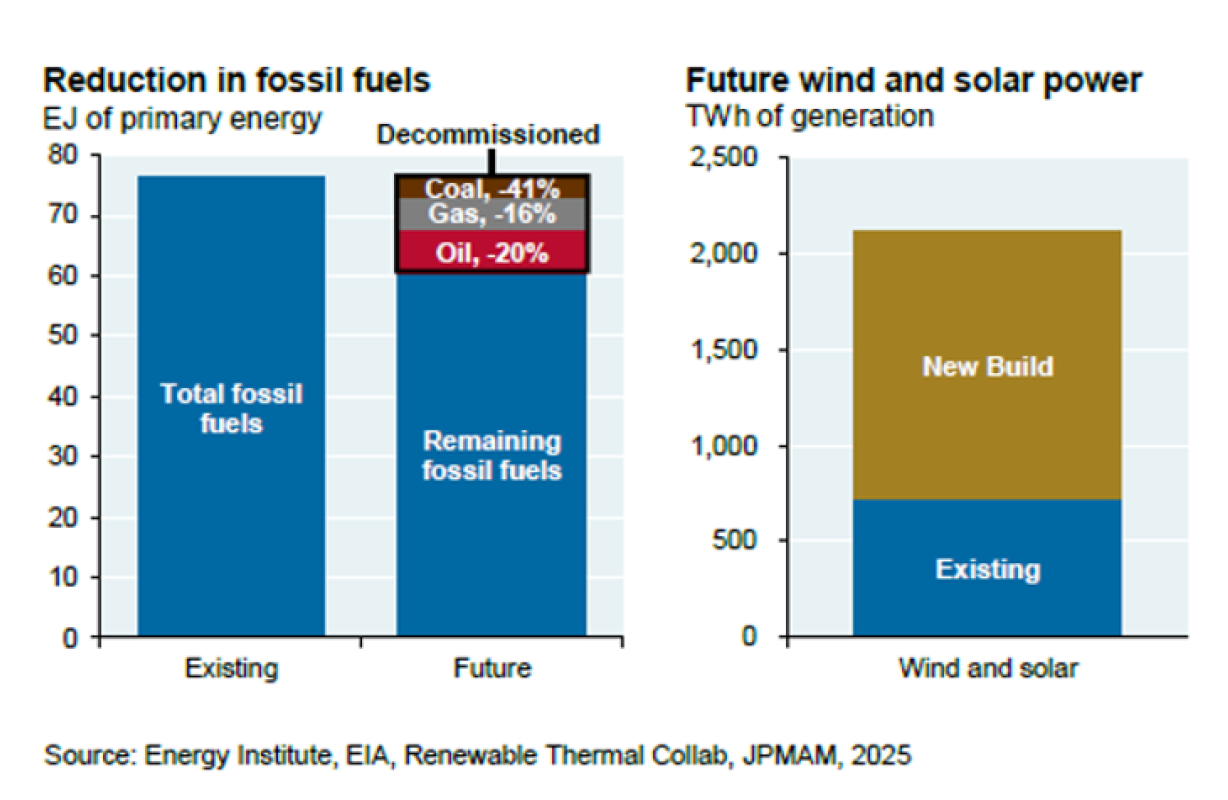 The war-related energy price surge, even if temporary, highlights the economic vulnerability related to fossil fuels. It also strengthens the case for renewable energy not just as a climate or cost argument, but as a matter of energy security. The same J.P. Morgan report illustrates both the opportunity and the scale of the challenge: a plausible decarbonization path would cut total US fossil fuel consumption by roughly 20%, with coal consumption falling 41%, gas 16%, and oil 20% (see chart below). Getting there would require cuts in coal- and gas-power generation, replacing internal combustion engine vehicles with EVs, and converting a meaningful share of residential and commercial heating to electric heat pumps powered by renewables. It would also require wind and solar capacity to triple from current levels (a build-out of roughly 14 years at today's pace). The war doesn't change this math, but it compresses the timeline: higher prices and security concerns add new urgency to a transition that was already going to take a decade-plus of massive-scale investment. If the US wants true energy independence (and the security that goes with it), building out renewable infrastructure is part of that answer, not separate from it.